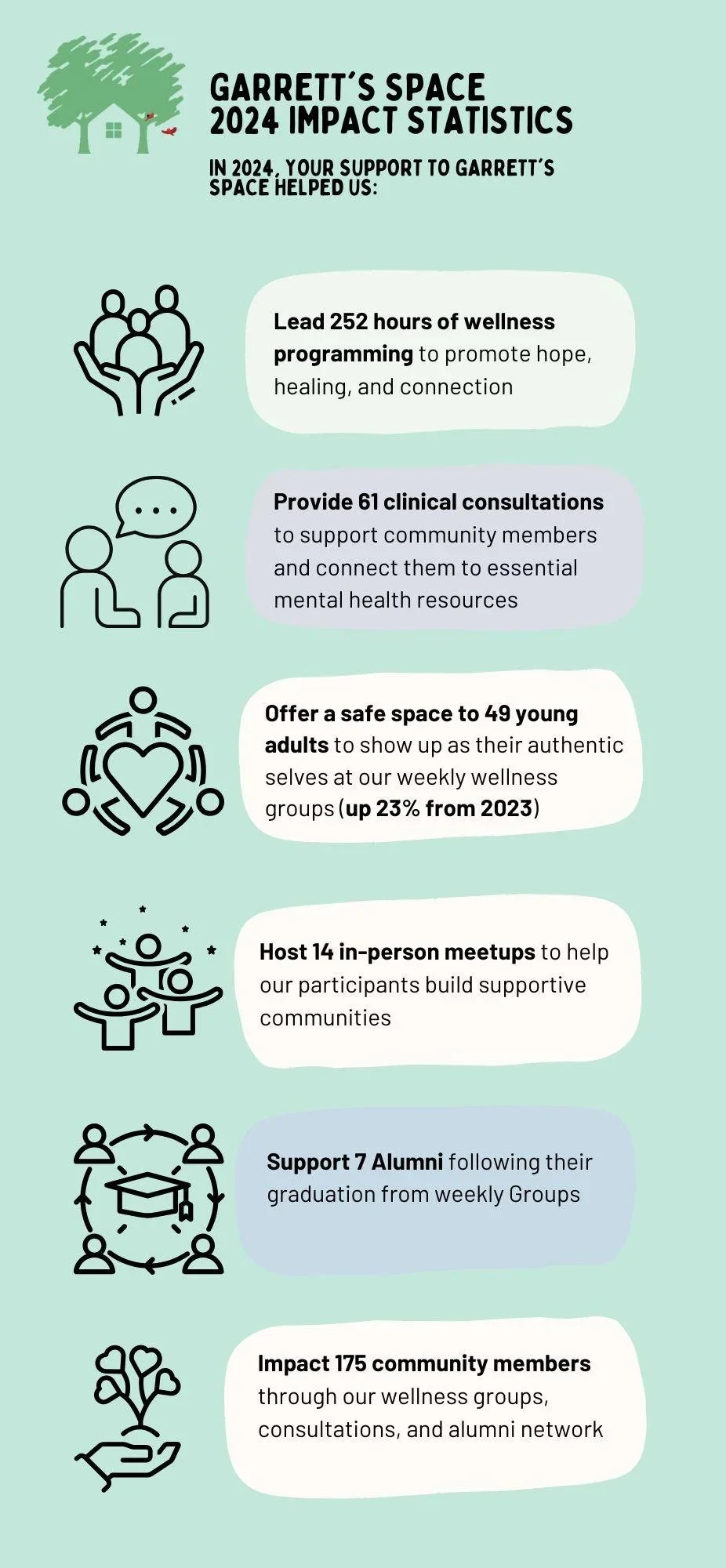 As we begin 2025, our hearts are full of gratitude for the incredible journey we had in 2024. Thanks to your support, we've continued to expand our mission of bringing hope and healing to young adults facing mental health challenges in our community.